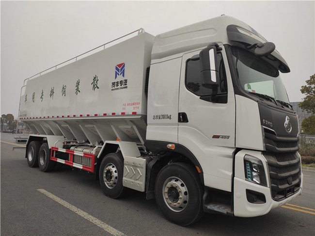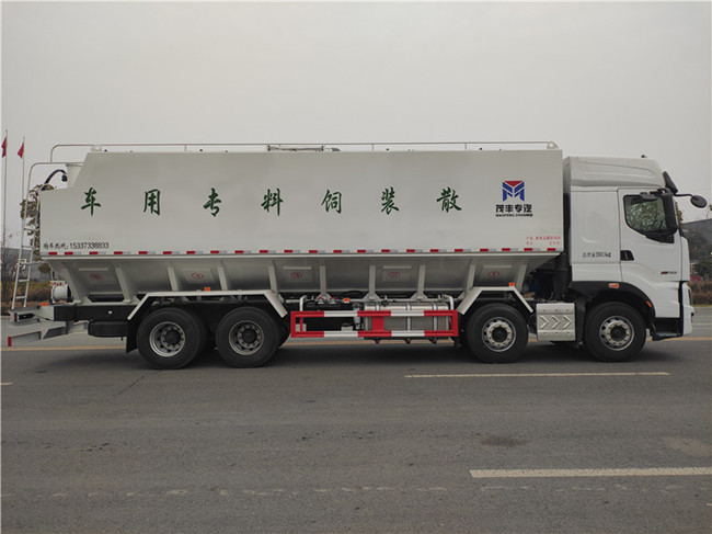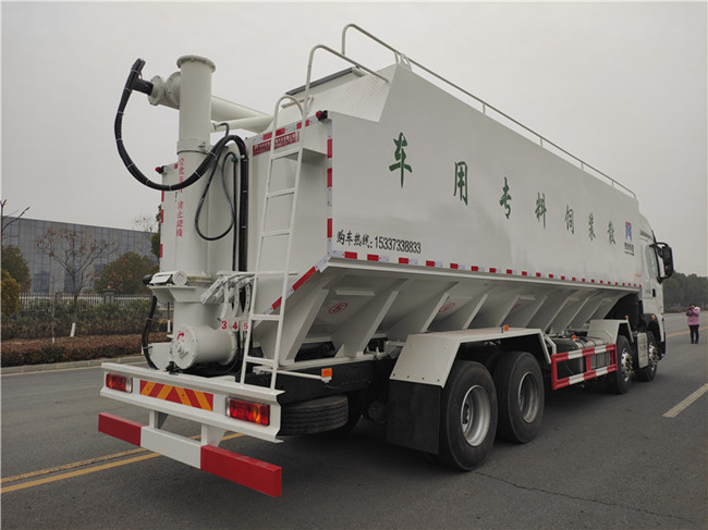 散裝飼料運(yùn)輸車,散裝飼料車的飼料罐架設(shè)在卡車的底盤上,罐頂開(kāi)有進(jìn)料口.頂部的一根螺旋輸送卸料管(俗稱卸料絞龍)則可自由回轉(zhuǎn)和抬升,抬升的仰角可達(dá)60度。運(yùn)輸時(shí),頂部的螺旋管平臥在罐頂;卸料時(shí)則抬起,使管端的出料口與畜禽飼養(yǎng)場(chǎng)貯料罐頂部的進(jìn)料門相接,駕駛室內(nèi)裝有操縱裝置(操縱裝置也可裝置在罐體尾部),卸料時(shí)通過(guò)車底的動(dòng)力輸出軸和減速器來(lái)驅(qū)動(dòng)螺旋,以完成卸料。